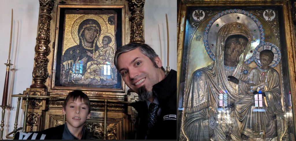 We have been attending Roman Catholic Masses at least every Sunday on this trip. For the last three months those Masses have not been in English. The Roman Catholic Liturgy is more consistent than McDonalds so despite only speaking English we are all, even the kids, able to follow exactly where in the Liturgy we are at any time. This familiarity with Roman Catholic Liturgy did not help us follow the Orthodox liturgy. For two hours we mostly stood and listened to chanted prayers in what we later learned was Greek. The only words I picked up in two hours were “Kyrie eleison” and “Alleluia”. We know these from the Roman Catholic Liturgy but I didn’t understand anything else.